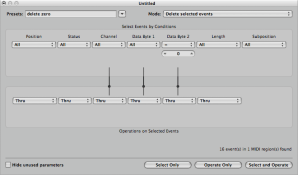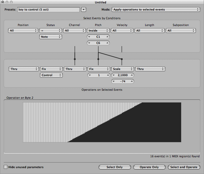 With this, all zeros caused by note-offs are deleted – just remember to press “Select” first, then “Operate”, or if you’re certain and confident enough, press “Select and Operate”, but be warned: my Logic Pro 8.0.2 doesn’t always work correctly. Sometimes it just decides to delete everything in the event list. A bug, perhaps? What you’ll have in the Event List are only the control data events, between 1 and 127, which you’re about to use as such, or convert into something more comfortable. You could, however, combine this and the following into one Transform Set.