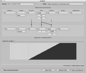 Second, prepare a few Transform sets. The first one is meant to convert the note-ons of a 5-octave keyboard into control data (or fader data, just replace the resulting Control selection with Fader, in the lower section).